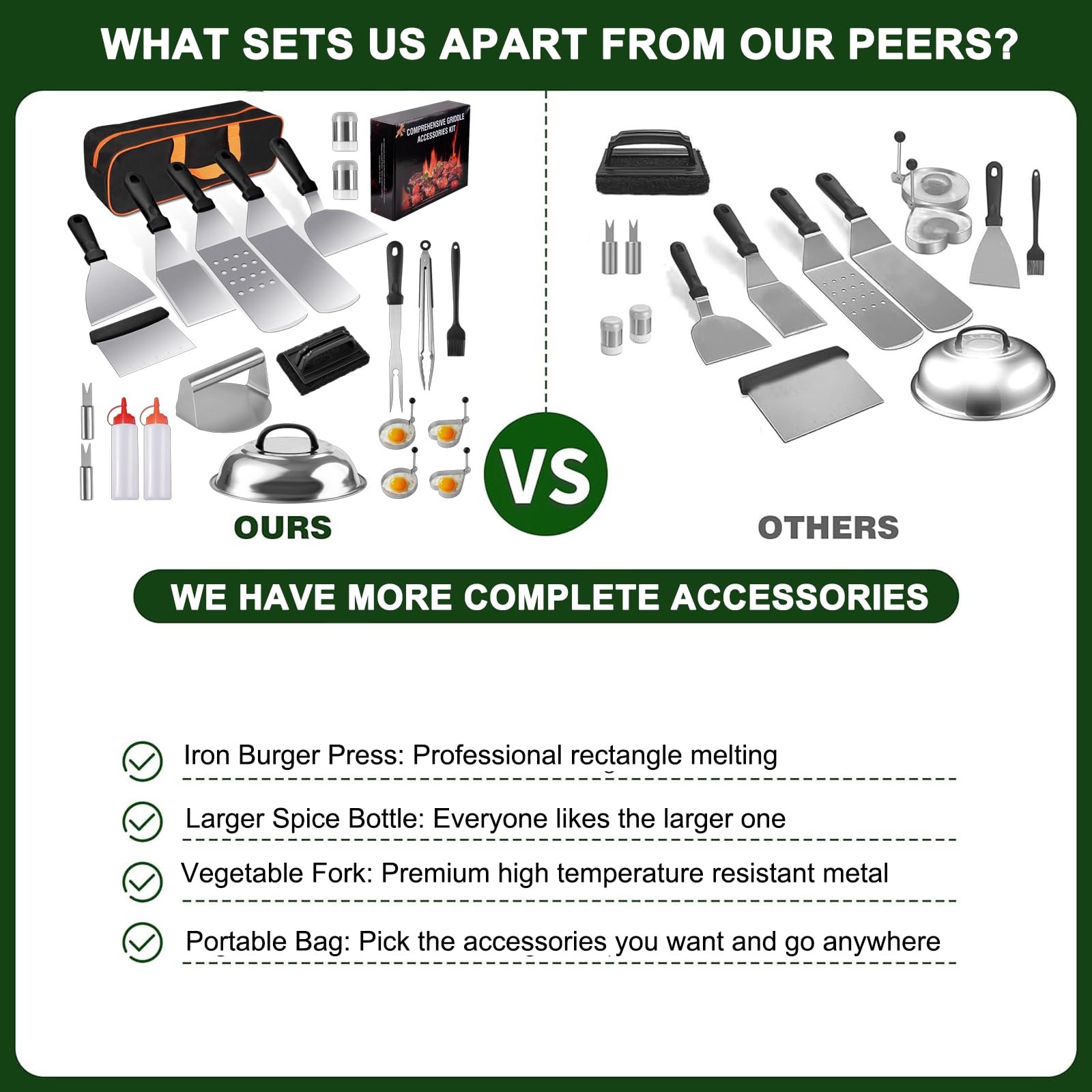 - 【Food Grade Professional Griddle Spatula Set】 Our griddle accessories kit is made of food grade high-quality stainless steel and BPA free , heat-resistant and rust-proof, safer, more durable and easy-to-clean toolset to camping or cooking without worry about your tools bending, breaking or rusting again, you can use it with confidence.