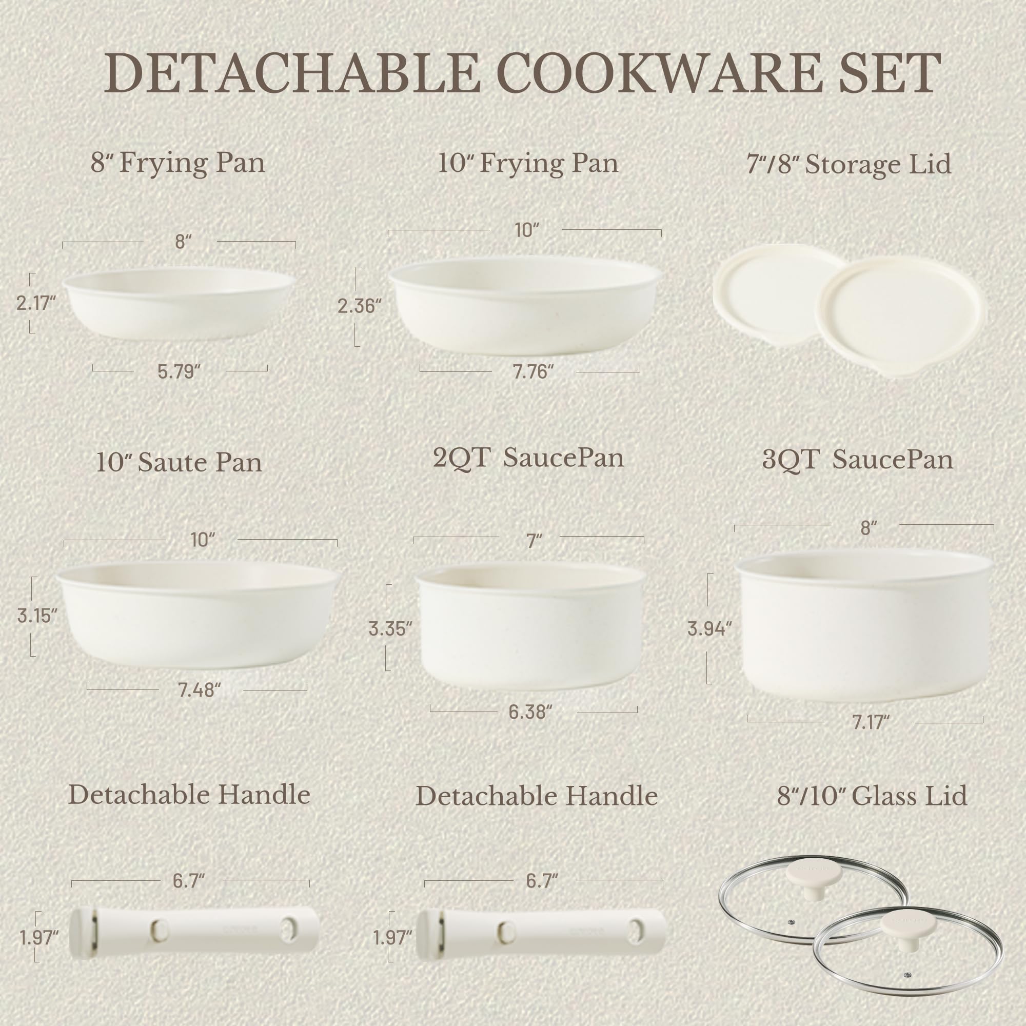 - · Multitaskig Cookware Set: Removable handle for the ultimate versatility– go from ALL kinds of stoves to the oven, to the grill, to the fridge, and onto the table in a click. The handle is upgraded for secure when attached during cooking.