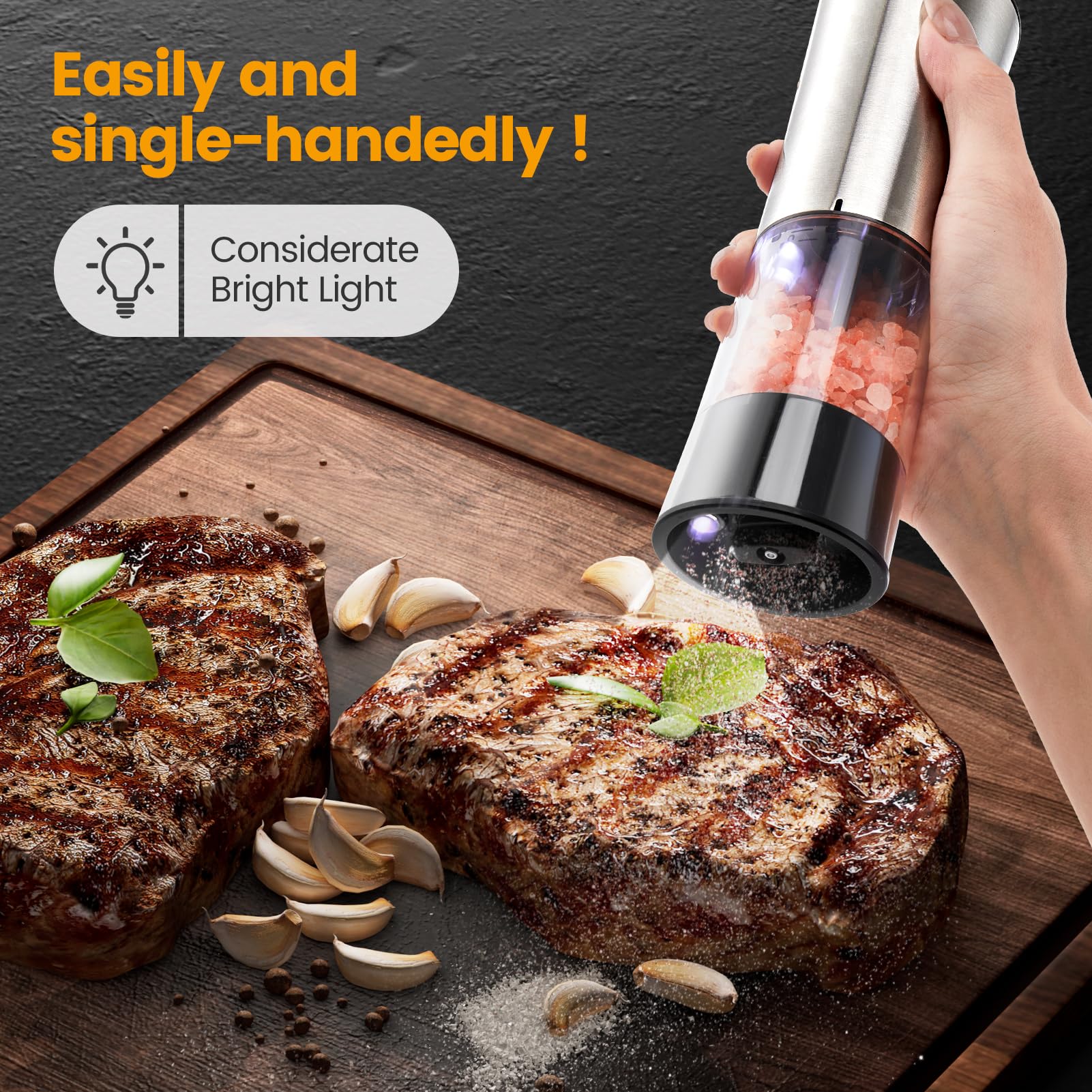 - 【Gravity Electric Salt and Pepper Grinder Set】These salt and pepper grinders feature a gravity-charged design that makes it easy to grind salt and pepper with one hand - just set the grind, turn it on, and flip it over ! Makes it easy to season your dishes.